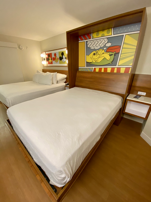 The rooms at Pop Century were refurbished in 2018 with a sleek hardwood floor, queen beds (including 1 Murphy bed, pictured below), sliding barn door dividers for the sink area and new Mickey Mouse & Pluto theming giving the whole space a bright and fun uplift. Being able to fold up the bed during the day is amazing for the additional space.