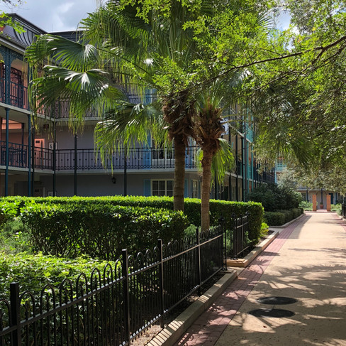 French Quarter is inspired by the historic New Orleans district. With cobblestone streets, wrought-iron balconies, and gas-style lanterns, you’ll feel like you’ve stepped into a quaint southern neighborhood. The resort grounds are colorful with neatly trimmed hedges, fountains tucked into courtyards, and plenty of (shaded) walkways to explore.